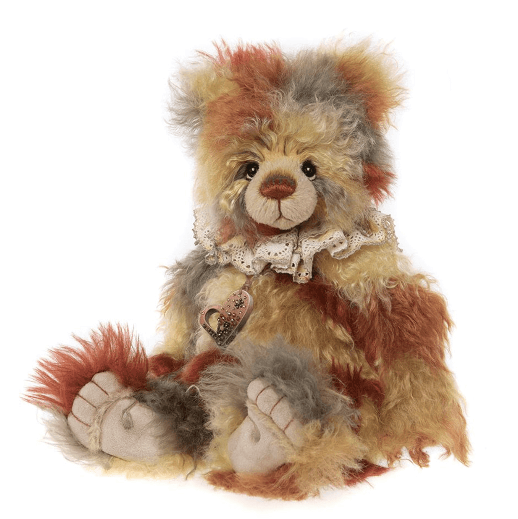 Charlie Bears Baroque is a stunning Isabelle Collection panda. She is one of four bears named after architectural periods in time, the Baroque period started in Italy in the 17th century. She is crafted from a combination of mohair and alpaca in a flamboyant mix of yellow, burnt orange and grey. Baroque wears a collar, which features a tinted edging for an antique feel, as well as a decorated orange and dark brown ombre coloured heart necklace.