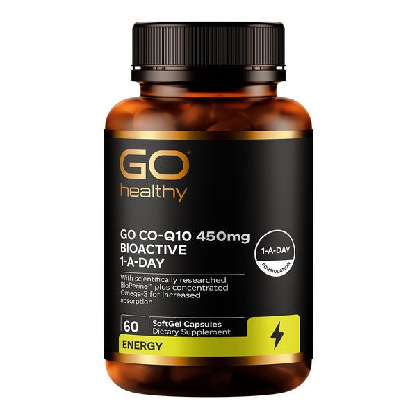 GO CO-Q10 450mg BioActive 1-A-DAY is a superior strength Co-Enzyme Q10 complete heart health and energy formula. Co-Q10 450mg has been combined with the scientifically researched BioPerine® plus concentrated Fish Oil (Omega-3) for enhanced absorption. Co-Q10 supports heart health, promotes energy and offers superior antioxidant protection. Omega-3 provides high levels of EPA and DHA which support general health and wellbeing. All supplied in an easy to take, 1-A-day dose.