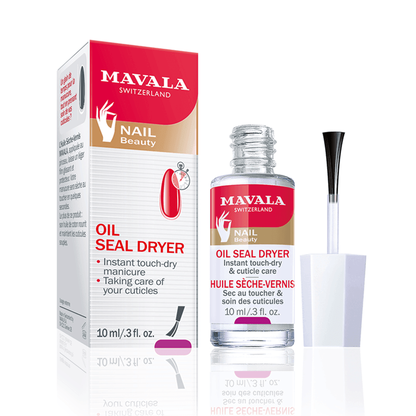 After nail polish and Colorfix Top Coat application, wait for a few seconds. Then apply quick brush strokes of Mavala Oil Seal Dryer onto the nail surface, slightly going onto the nail contour. Ensure you hold the brush flat without applying too much pressure. Leave it to act for a few seconds.