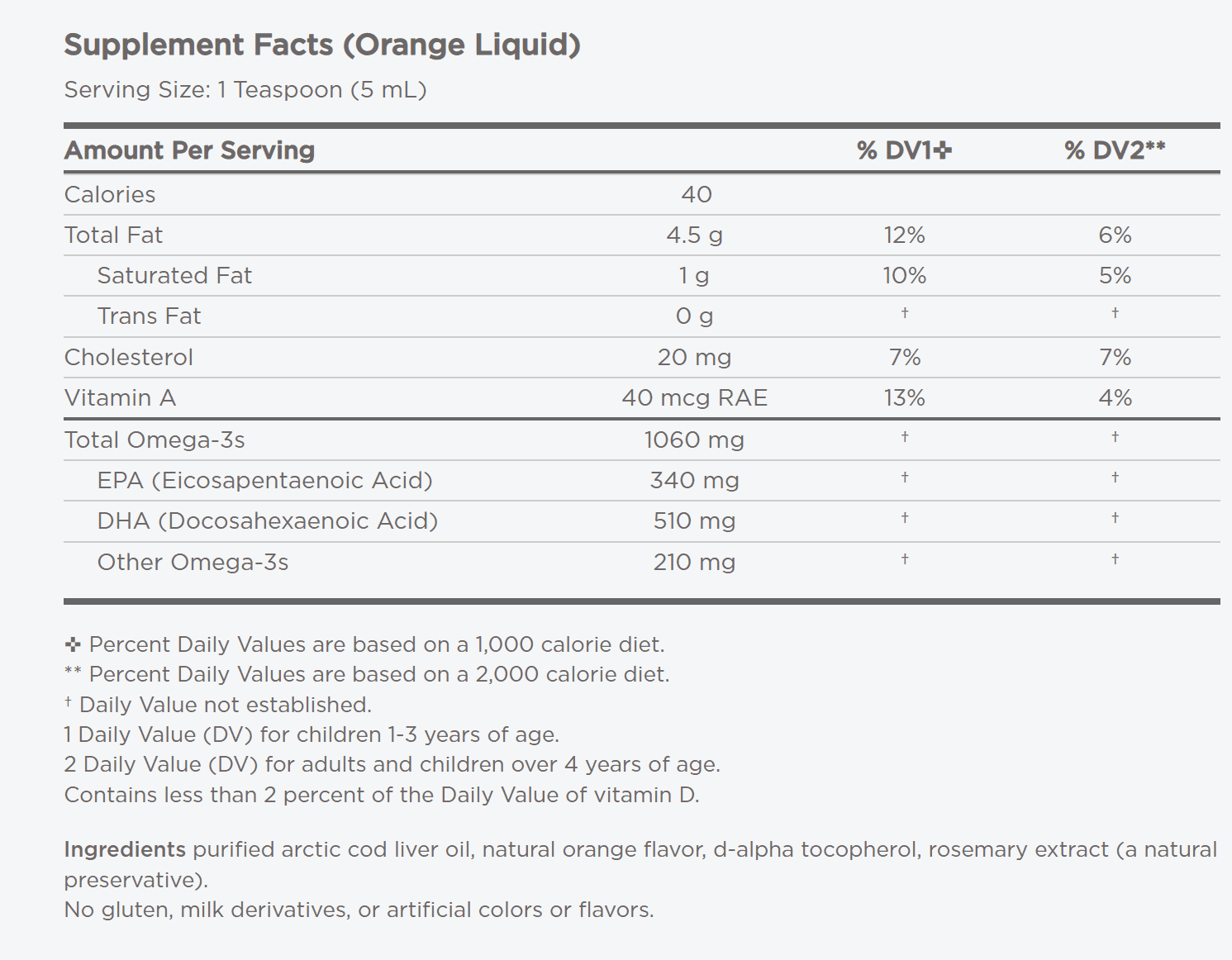 750 mg total omega-3s (soft gels); 1060 mg total omega-3s (liquid)