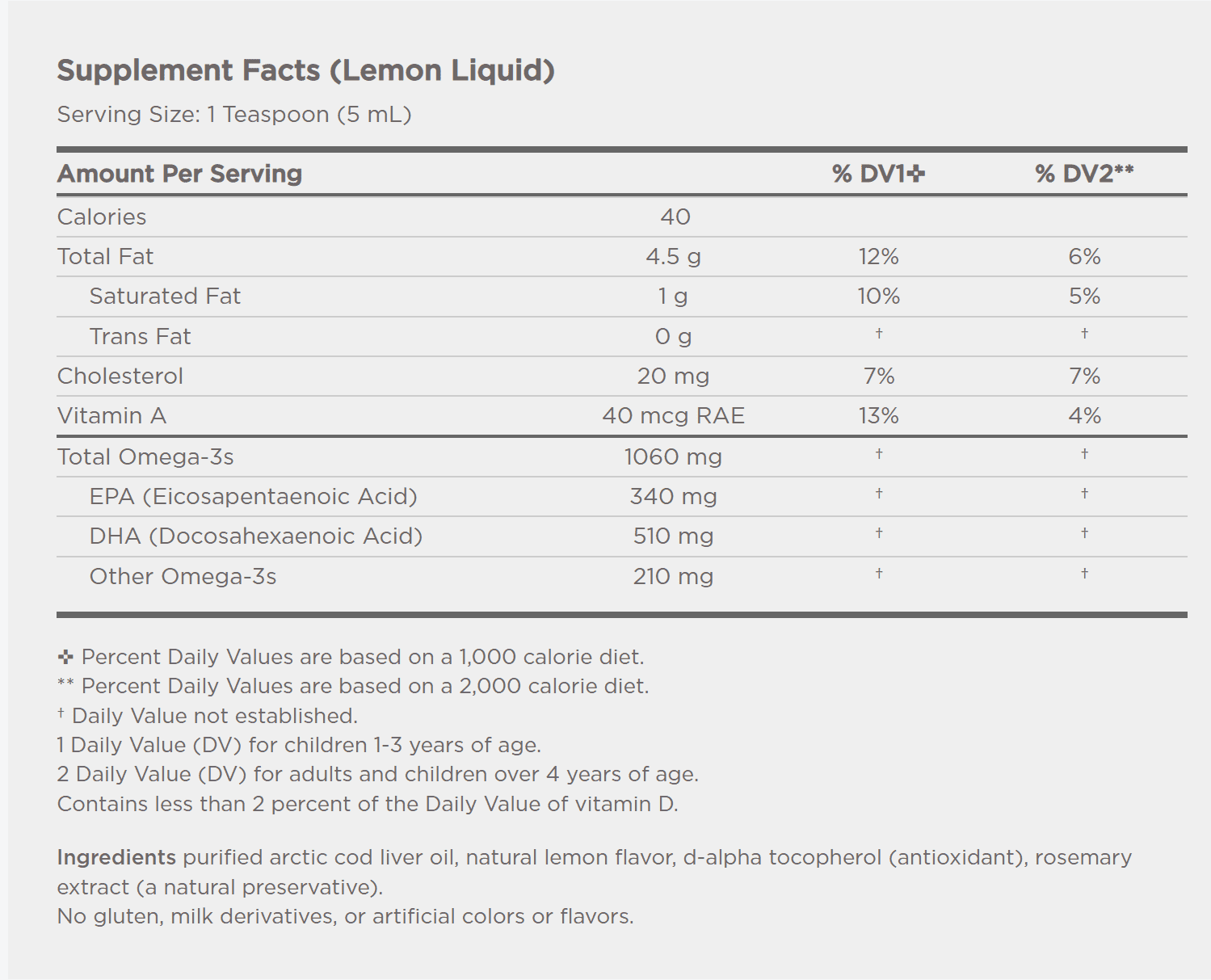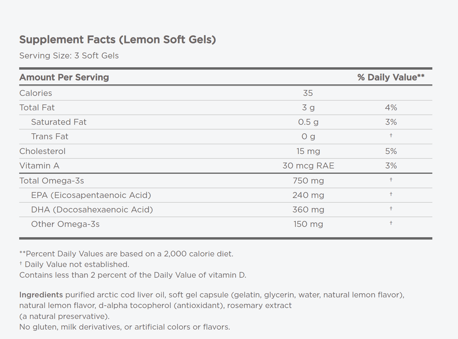 Other Ingredients: Purified Arctic Cod Liver Oil, soft gel capsule (gelatin, glycerine, water, natural lemon flavour), natural lemon flavour, d-alpha tocopherol, rosemary extract (a natural preservative).
