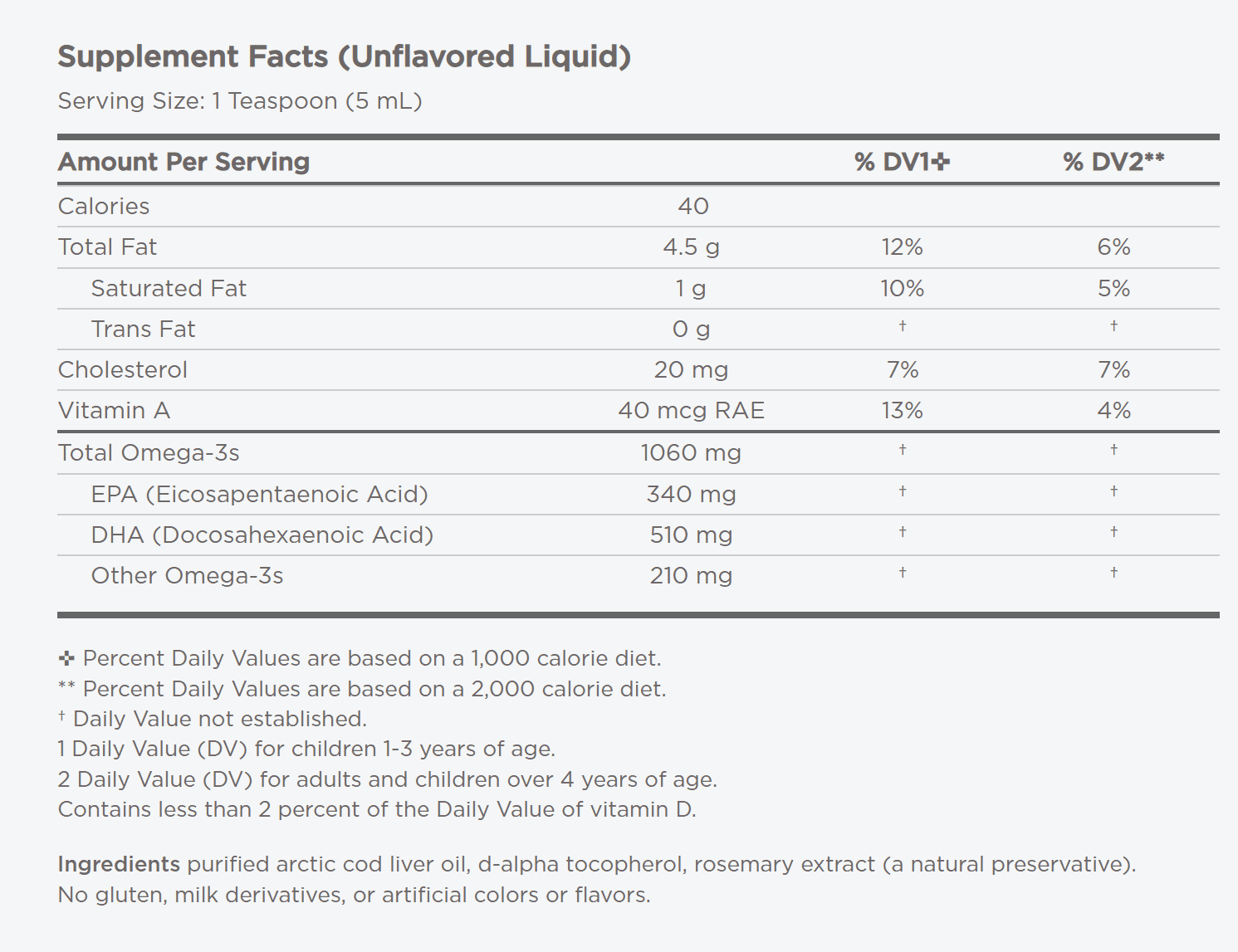 Unflavoured - Purified Arctic cod liver oil, d-alpha tocopherol, rosemary extract (a natural preservative).