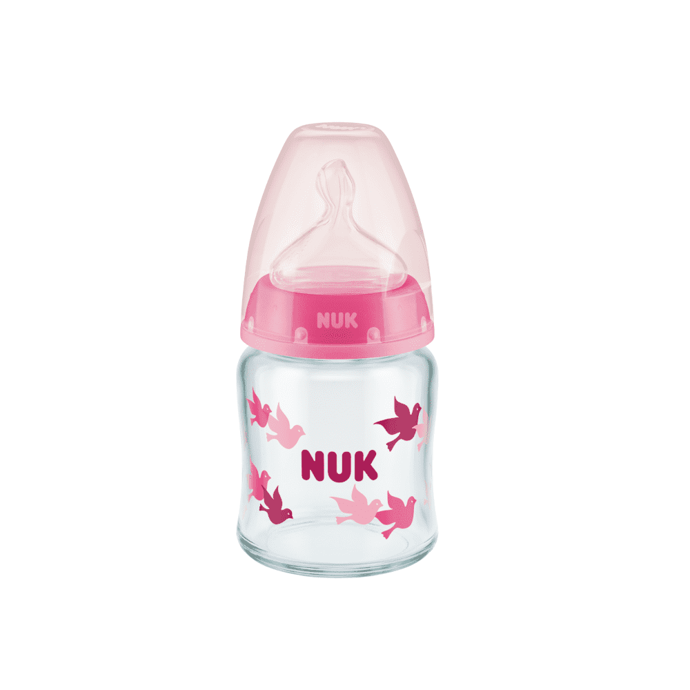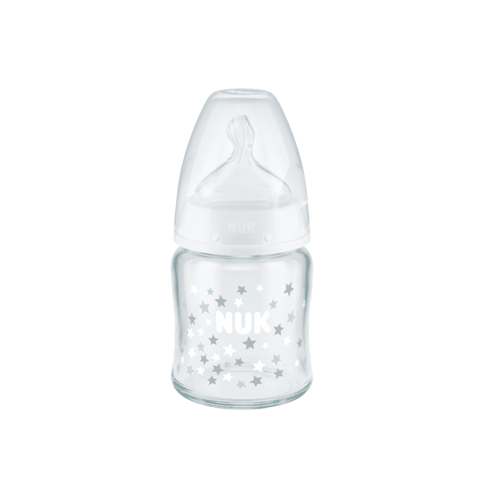 NUK First Choice+ Glass Baby Bottle with Temperature Control, right for the jaw, 120ml, 0-6 months, M (medium feed hole = for formula)