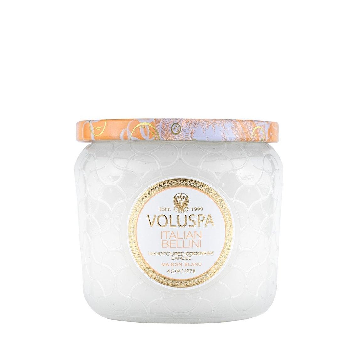 A surprising hint of decor for any space, the Petite Jar Candle is eye-catching with its creamy white glass expertly embossed in VOLUSPA's signature Maison Collection pattern. A metallic decorative lid can be used to extinguish the flame or keep the candle dust-free when not in use. This candle makes the perfect travel companion or thoughtful gift.
