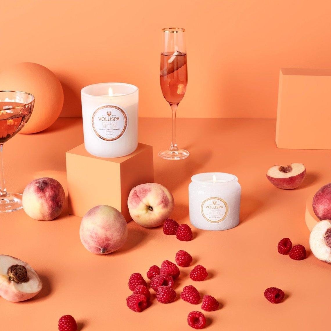Take a moment to admire VOLUSPA's Italian Bellini... highlighted by the effervescent scent of iconic sparkling champagne - a cocktail of fresh white peach, pureéd with berries and delicate rosewater. This festive scent says "Cheers!" to celebrate special days and joyfully lifts spirits to transform lackluster into celebration.