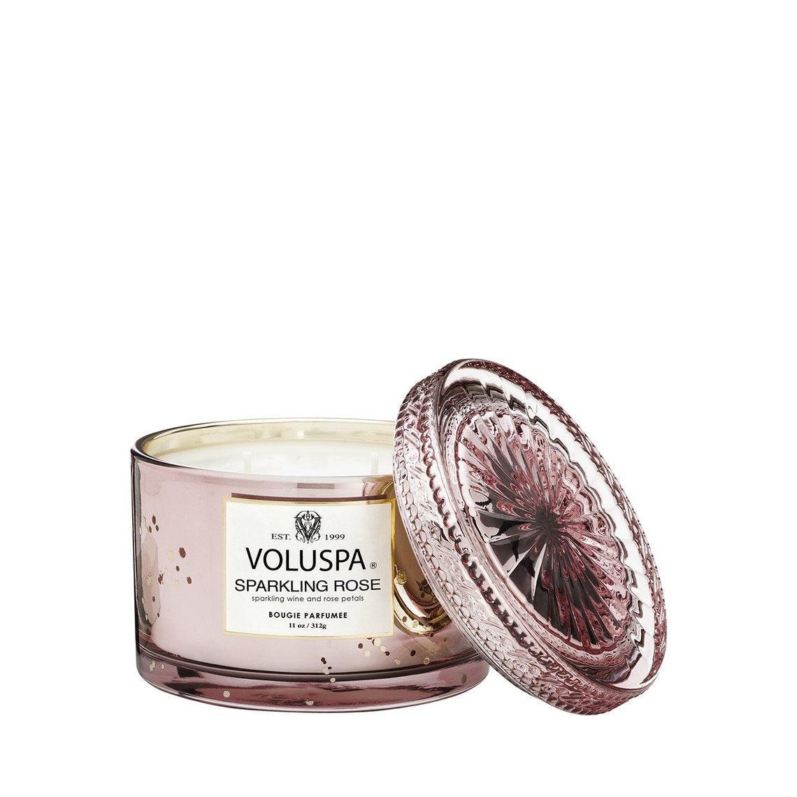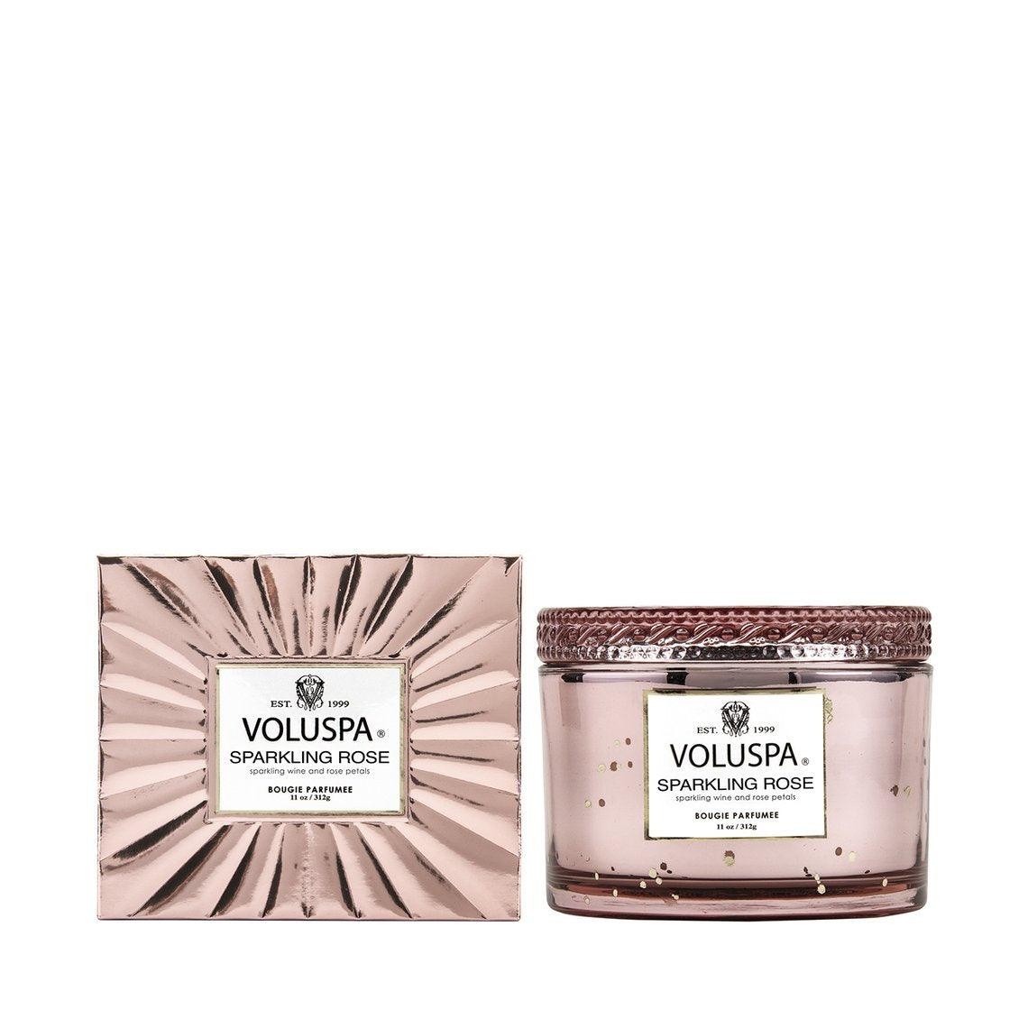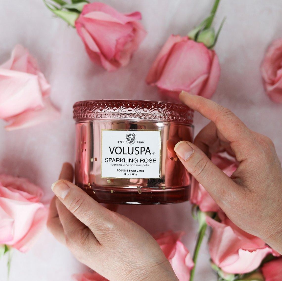 Delight in VOLUSPA's Sparkling Rose Corta Candle with its delicate fragrance... notes of sparkling wine chilled and poured over ice and edible white rose petals. Presented in gorgeous mirrored pink glass inspired by the rich lustre of vintage vermeil.